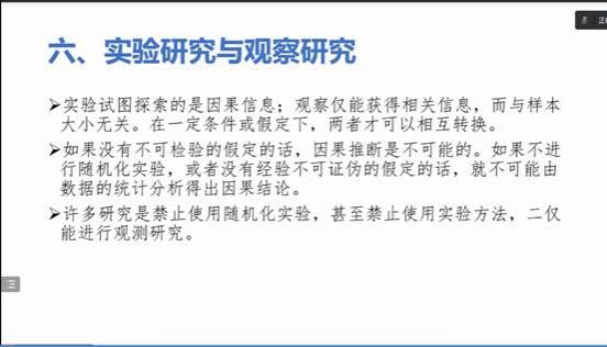 在本次讲座中,白强老师通过列举实际生活中的例子引入相关关系与因果关系的联系与区别,提出相关性是对称的而因果性是单向非对称的概念。然后简单说明了中国古代各个学派对于因果的思考与西方世界对于因果的重视,进而提出中国古代和西方世界关于因果思想的著作。通过对赫克曼问题的简单介绍,他提出大学生正处于大数据时代,不仅要观测事物之间的相互关系,更应该挖掘隐藏在大数据中的因果关系。身处于能轻易接触到大数据时代的我们更应在生活中细心观察,认真思考各种事物之间的因果关系。