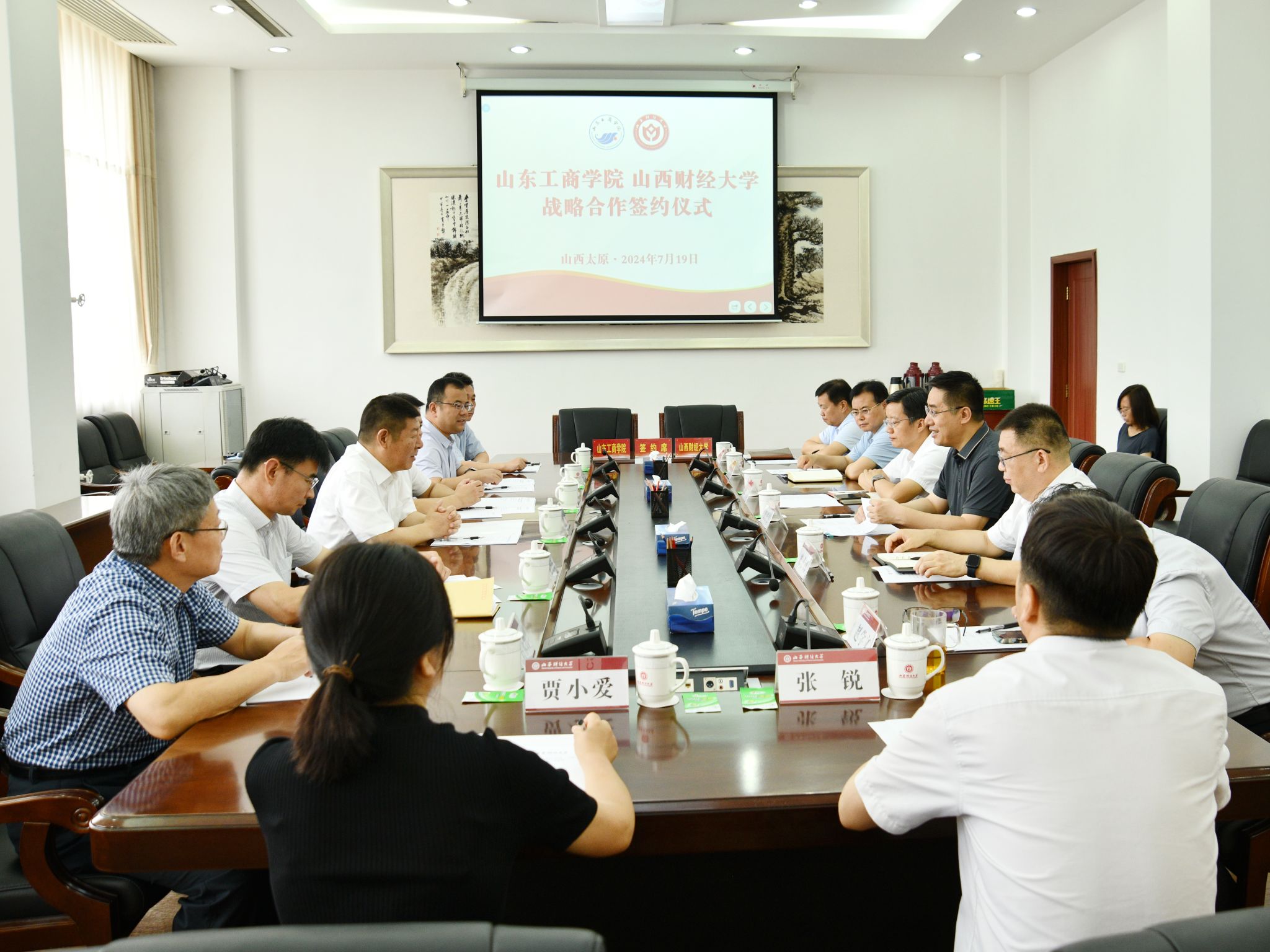 田祥宇代表学校向陶虎校长带领的山东工商学院一行表示热烈欢迎,并从专业建设、学位建设、学科发展和目标远景等方面介绍了学校的基本情况。他指出,双方本着“共享资源、共同发展、共创未来”的原则,决定签署战略合作协议,既是两校深化友好合作之举,也是一次邀约同行、共同进步之举。希望以此次签约为契机,在双方多年合作的基础上,通过资源共享、优势互补,进一步密切沟通、加强协作,落实好协议内容,共同开创两校教育事业发展新局面。