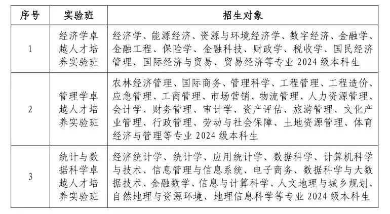 (一)学校将面向 2024 级本科生开设经济学卓越人才培养实验班、管理学卓越人才培养实验班、统计与数据科学卓越人才培养实验班各 1 个班。