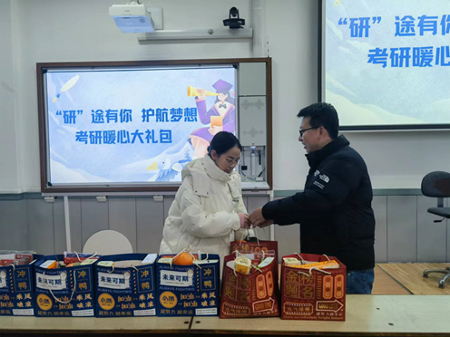 全国硕士研究生招生考试开考在即,为缓解考研学子备考压力,坚定考研信心,积极冲刺迎考,12月12日,betway88西汉姆在笃行201教室开展“研途有你 护航梦想” 暖心加油包发放活动,学院党委副书记、团委书记、班级辅导员和 2020级全体考研学子参加。