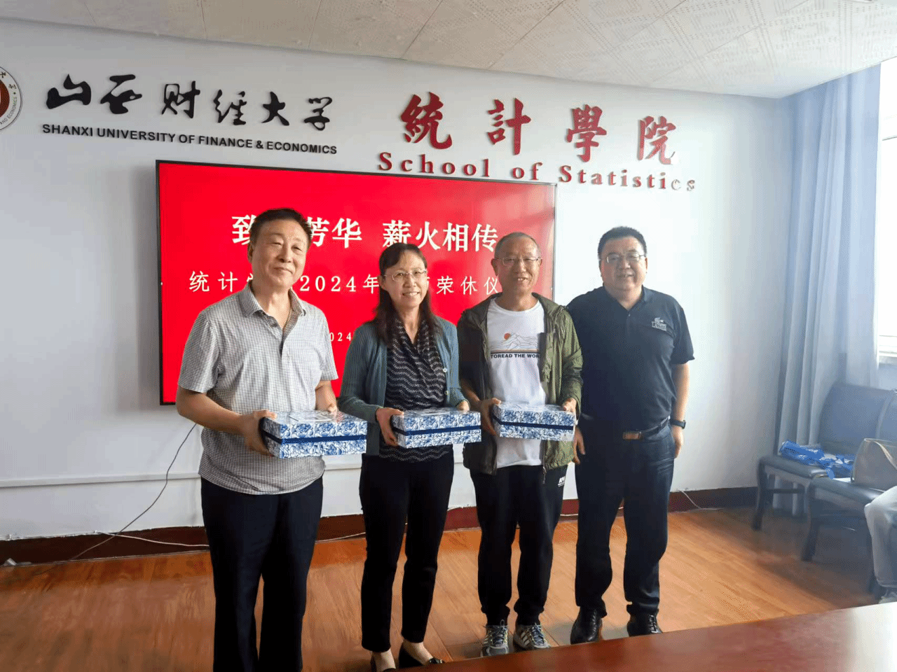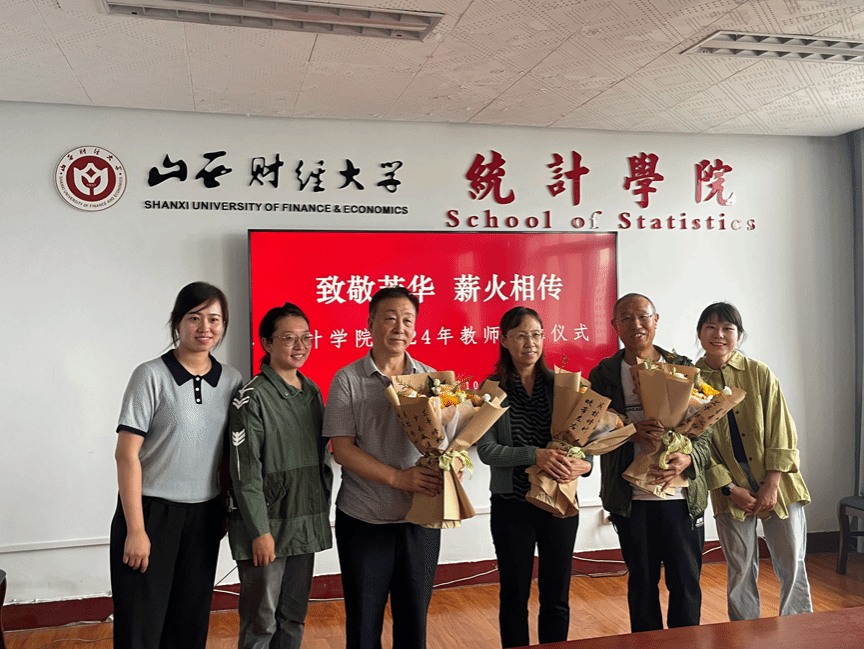 与会伊始,学院三位年轻的教师代表为三位退休老师献上鲜花,立志传承老教师的高尚品格和宝贵经验;米子川院长代表学院为三位老教师送上纪念龙盘,祝福三位老师退休生活幸福而美好。