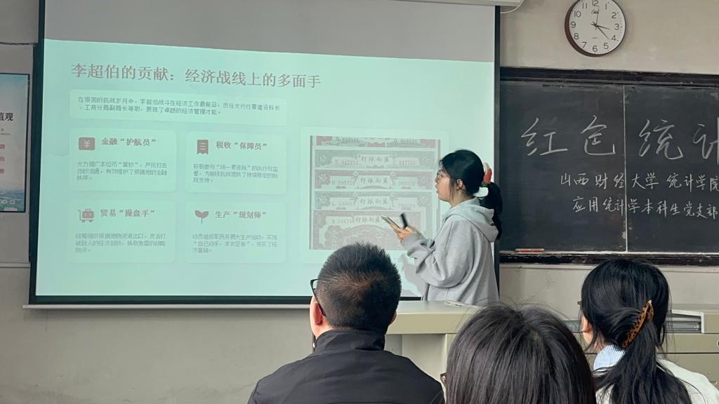 康佳欣同学紧接着以《李超伯:从太行烽火到国家统计的红色经济管家》为主题,讲述了山西平遥籍革命家李超伯的光辉事迹。从太行根据地的经济斗争,到新中国成立后参与构建国家统计体系,李超伯同志以实干担当践行初心使命,为国家经济“摸清家底”,成为新中国统计事业的重要奠基人。康佳欣同学的分享,让大家全面了解了先辈的奋斗历程,深刻领会了实事求是、严谨求实、服务大局的红色统计精神。
