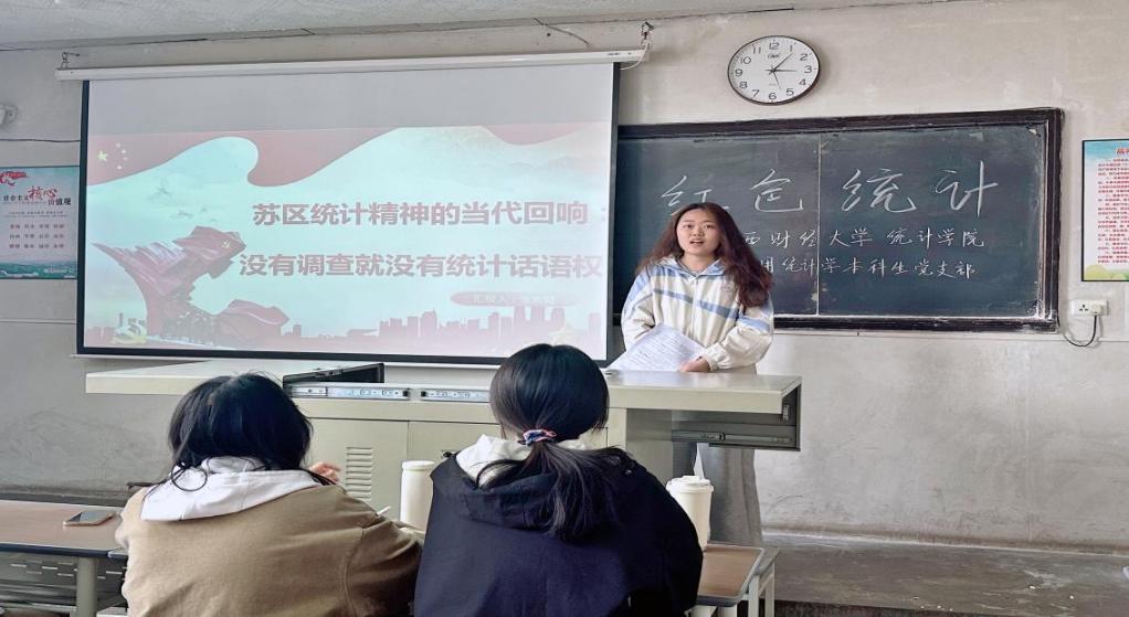 张宸璐同学首先以《苏区精神的当代回响》为题,从苏区统计工作的历史溯源讲起,系统阐释了苏区精神群众路线、依法统计、高效廉洁三大核心特质。通过引入《寻乌调查》《才溪乡调查》等经典案例,生动展现了革命年代统计工作者深入基层、求真务实的优良作风,让大家深刻认识到“没有调查就没有统计话语权”的深刻内涵。