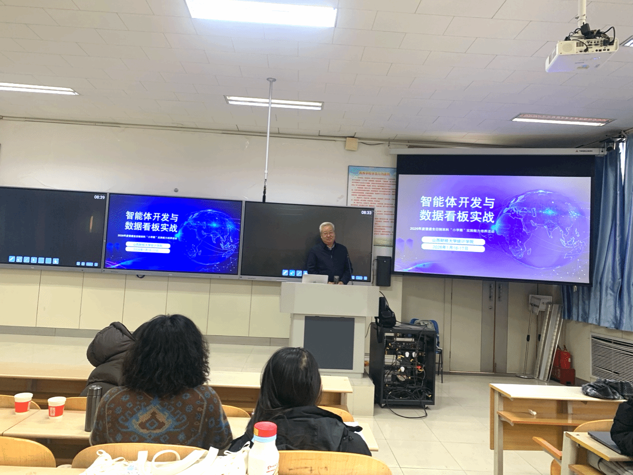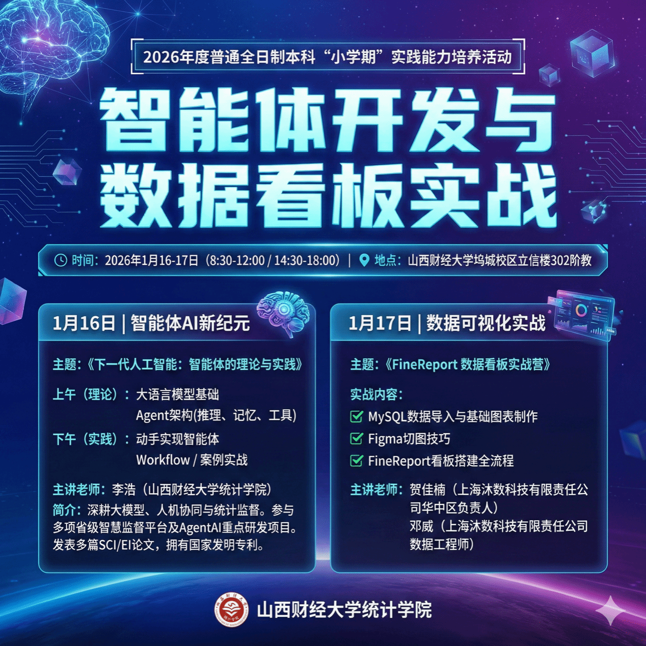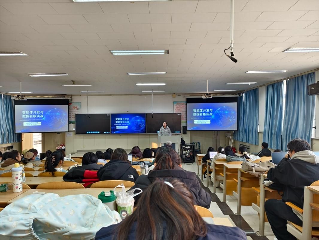 【导语】2026年1月16日至17日,betway88西汉姆2026年度普通全日制本科“小学期”实践能力培养活动——“智能体开发与数据看板实战”在坞城校区立信楼302阶教圆满举行。本次活动不仅是一场聚焦前沿技术的实战演练,更是一次温情的校友聚会,通过“校友领航+技能实战”的创新模式,为百余名统计学子开启了一扇通往数智未来的大门。