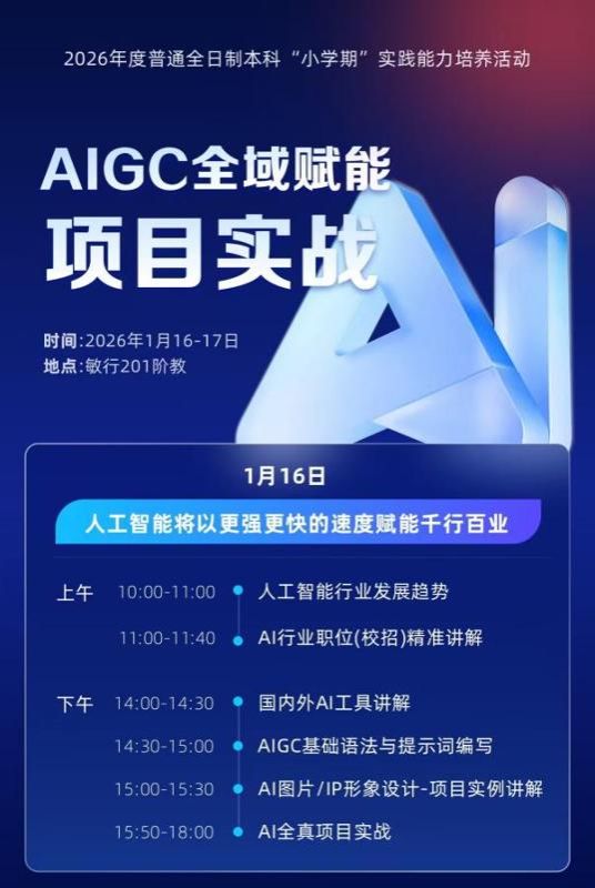 1月16日下午至17日,实训课程转入校内开展。清众科技股份有限公司派出由高志熙、韩炜、李晓等多位专家组成的讲师团队,围绕“AIGC全域赋能项目实战”这一主题,为同学们系统讲解了人工智能行业动态、AIGC工具使用、提示词工程、AI图像与视频生成、项目运营设计等内容。课程注重实操性与互动性,学生完成了从项目设计到内容生成的全流程任务,并在结营前进行了成果展示与交流点评。